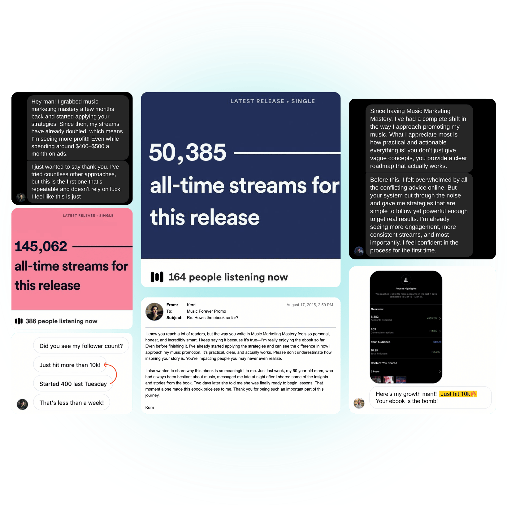 Results will always vary depending on the artist, the campaign, and — most importantly — the quality of the music. If you’re consistently putting out great songs and combine them with ads plus the strategies inside Music Marketing Mastery, you’ll be able to catalyze growth and build real momentum.